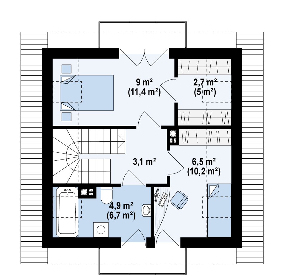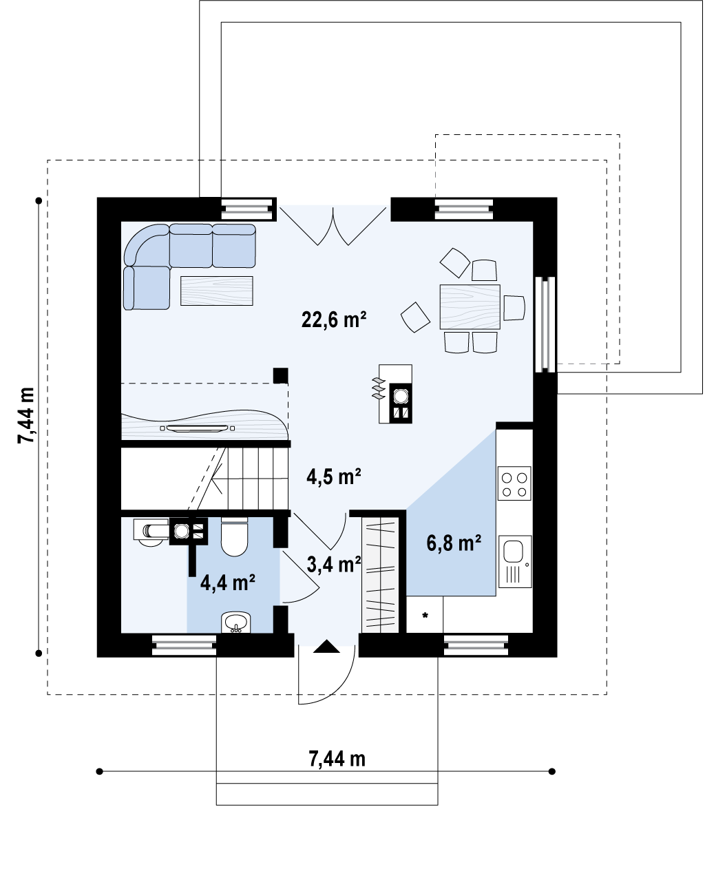 Площадь общая: 94.60 м2 Площадь застройки: 7.44 × 7.44