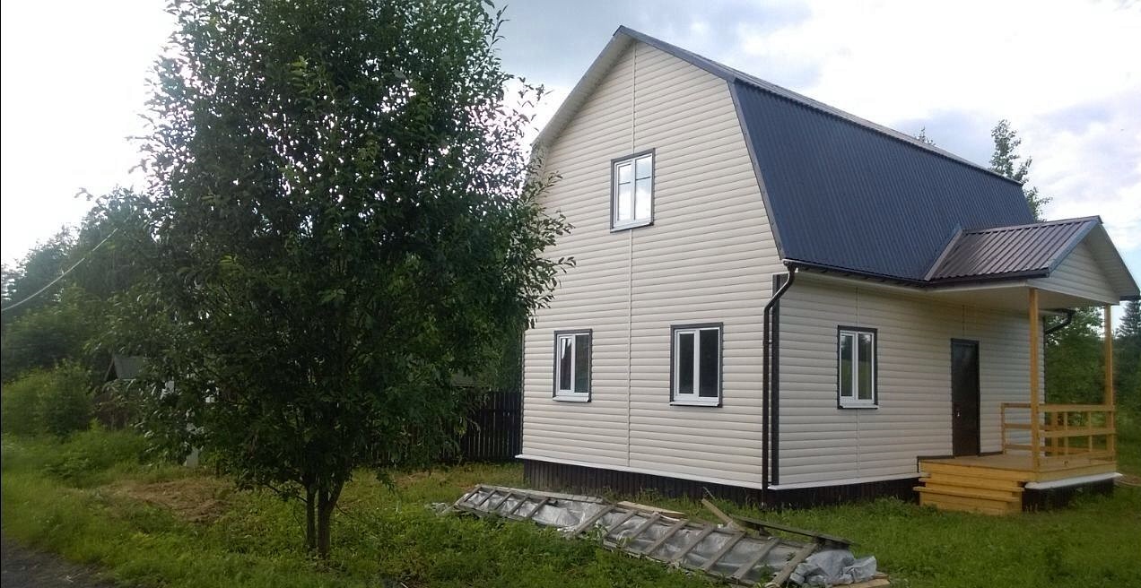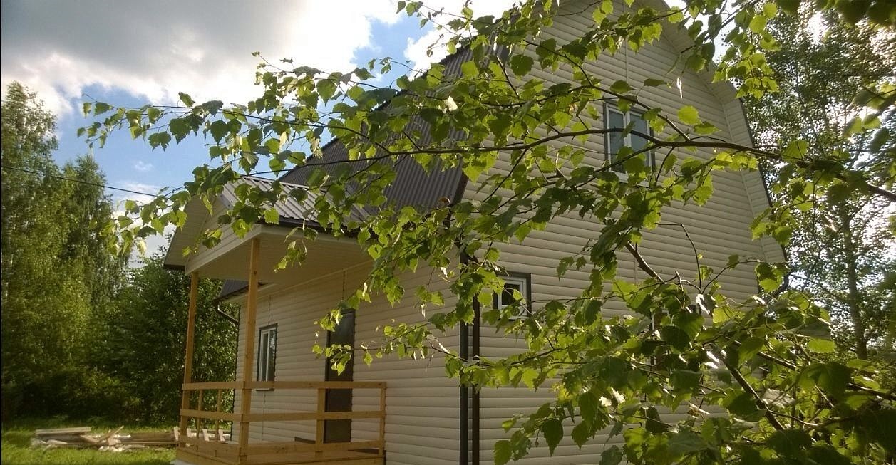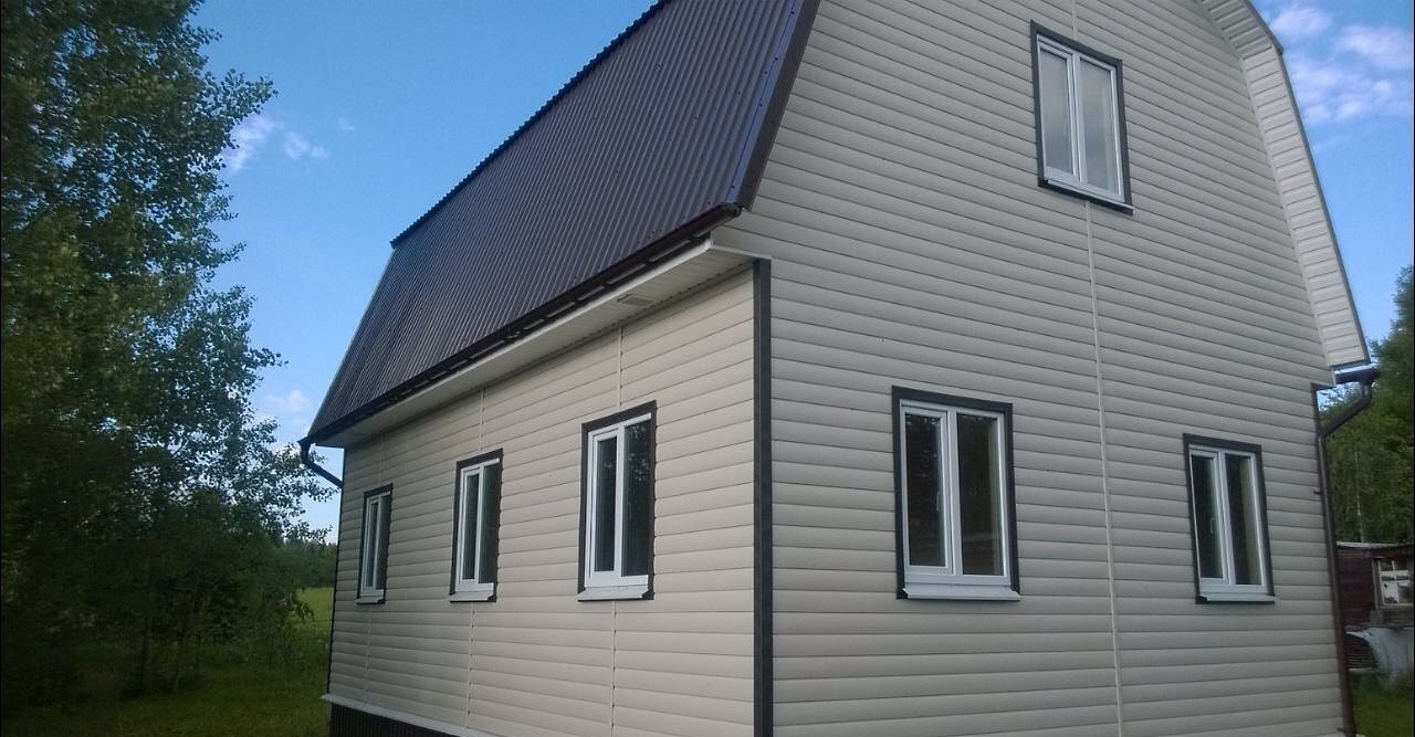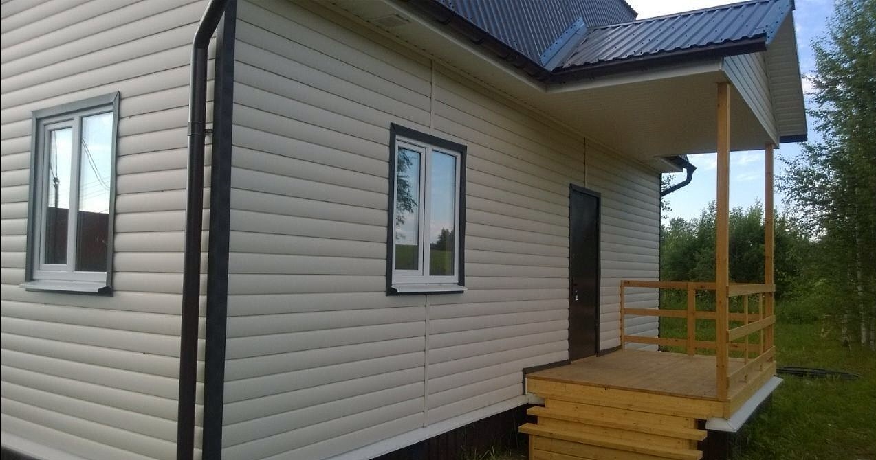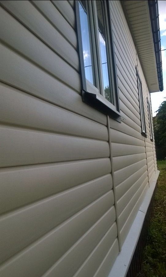 Снаружи дом отделан блокхаусом. Цвет сливки. Отделка углов и наличников – шоколад.
