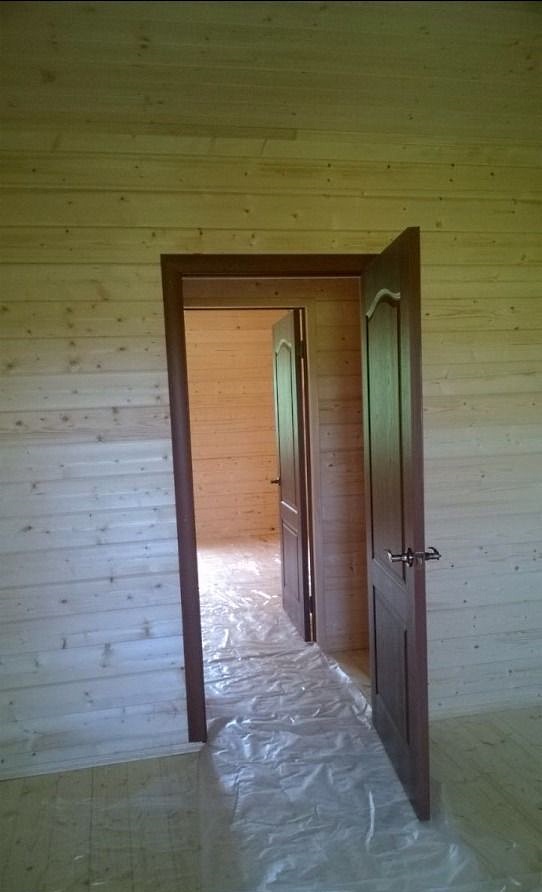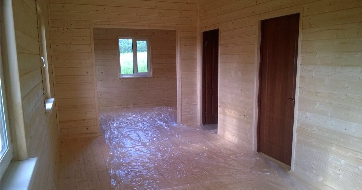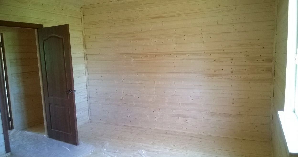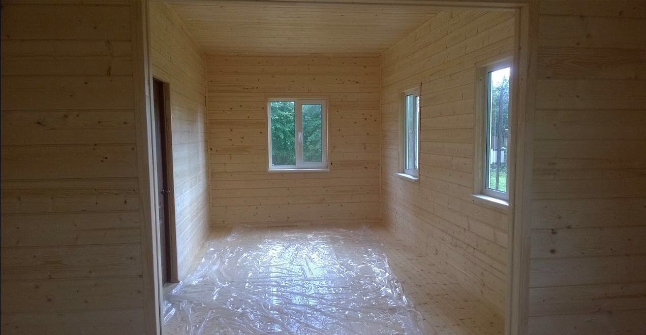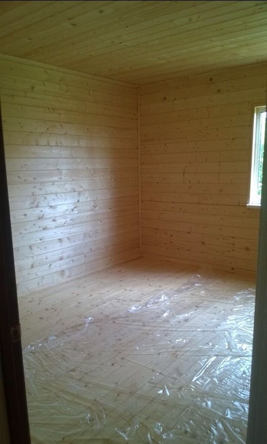 Отделка внутри — имитация бруса. Дом внутри полностью обработан финским лаковым покрытием.
